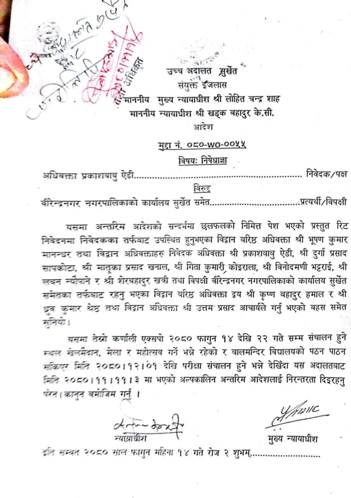 ‘यसमा तेस्रो कर्णाली एक्सपो २०८० फागुन १४ देखि २२ गते सम्म संचालन हुने स्थल खेलमैदान, मेला र महोत्सव गर्ने भन्ने रहेको र बालमन्दिर विद्यालयको पठन पाठन सकिएर मिति २०८०।१२।०१ देखि परीक्षा संचालन हुने भन्ने देखिँदा यस अदालतबाट मिति २०८०।११।११।३ मा भएको अल्पकालिन अन्तरिम आदेशलाई निरन्तरता दिइरहनु परेन । कानुन बमोजिम गर्नु ।’, आदेशमा भनिएको छ ।