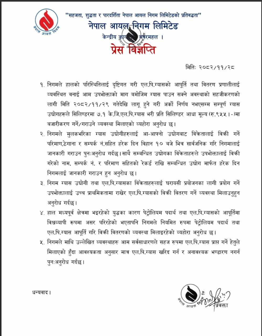 आम उपभोक्ताको मागलाई सम्बोधन गर्न निगमले हाल आधा सिलिन्डरर अर्थात् ७.१ केजी ग्यास ९ सय ५५ रुपैयाँमा बिक्री वितरण गर्ने निर्णय गरिसकेको छ ।