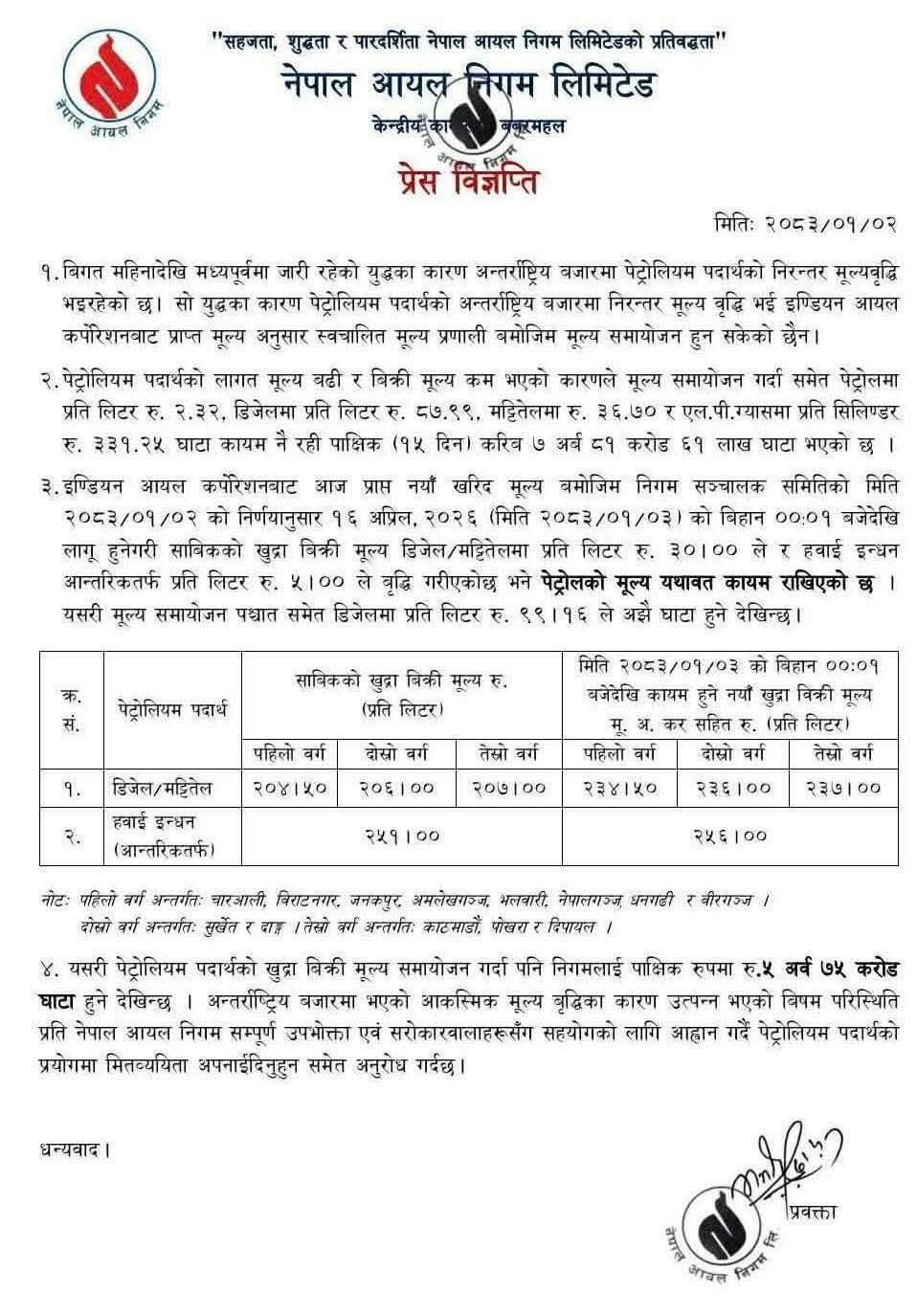 निगमका अनुसार डिजेल र मट्टितेलमा प्रतिलिटर ३० रुपैयाँ र हवाई इन्धन (आन्तरिकतर्फ)मा प्रतिलिटर ५ रुपैयाँ वृद्धि गरिएको छ । यद्यपि, पेट्रोलको मूल्य भने हाललाई यथावत् राखिएको निगमले जनाएको छ ।