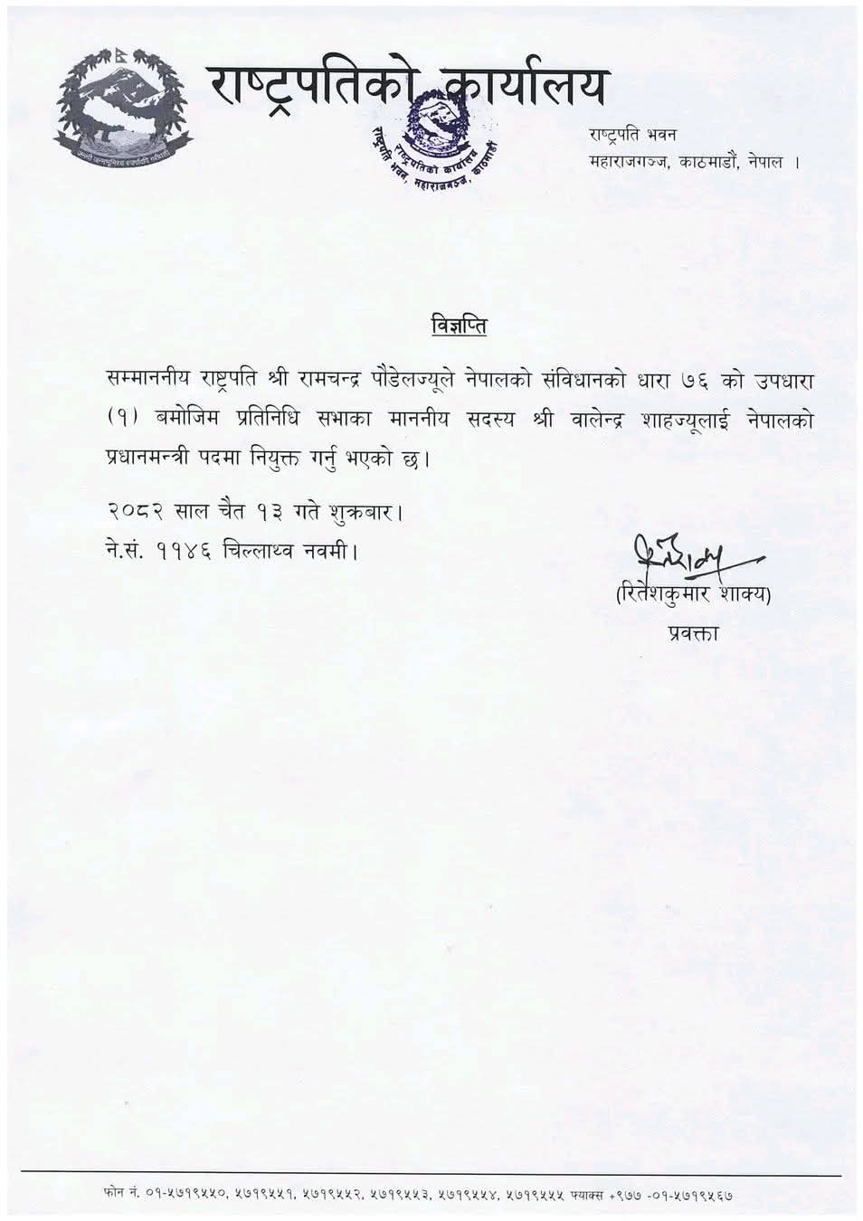 काठमाडौं । राष्ट्रपति रामचन्द्र पौडेलले प्रधानमन्त्रीमा राष्ट्रिय स्वतन्त्र पार्टी (रास्वपा) संसदीय दलका नेता बालेन्द्र साह (बालेन)लाई नियुक्त गर्नुभएको छ ।
