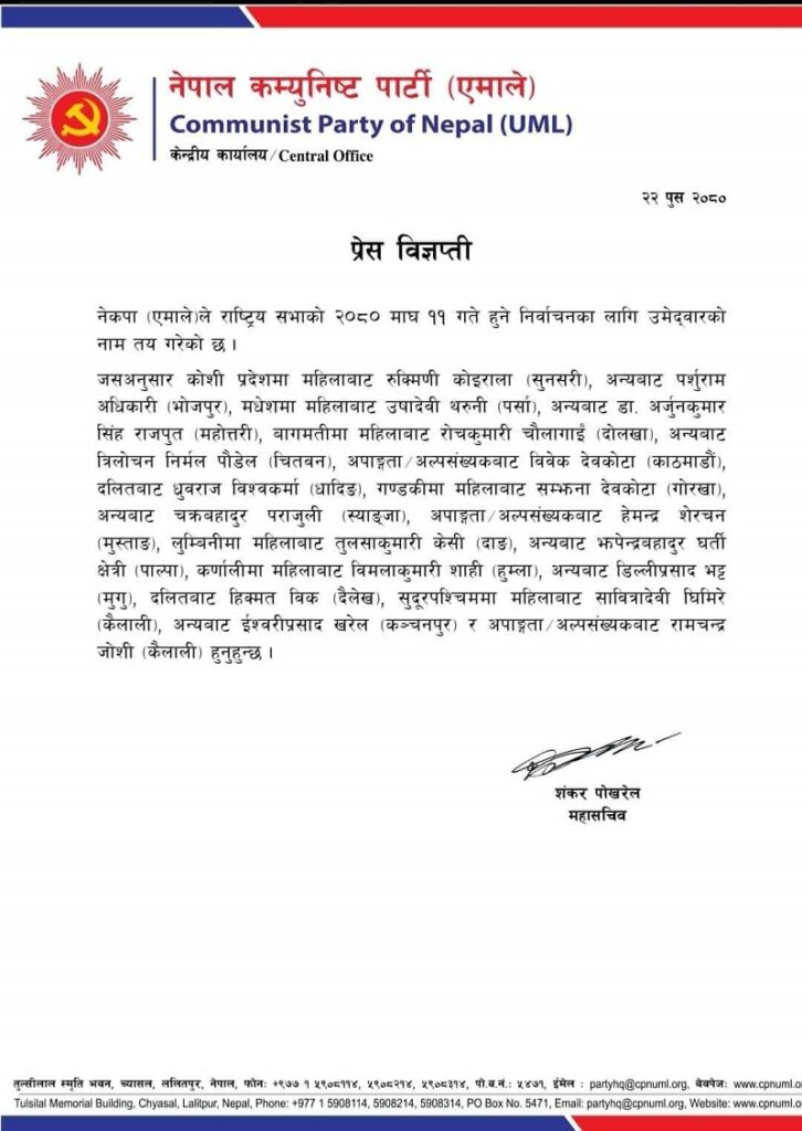 यस्तै कर्णालीमा महिलातर्फ विमलाकुमारी शाही, अन्यतर्फ डिल्लीप्रसाद भट्ट, दलिततर्फ हिक्मत विक र सुदूरपश्चिममा महिलातर्फ सावित्रादेवी घिमिरे, अन्यतर्फ ईश्वरीप्रसाद खरेल र अपाङ्गता–अल्पसङ्ख्यकबाट रामचन्द्र जोशीलाई उम्मेदवार बनाइएको एमालेले जनाएको छ ।
