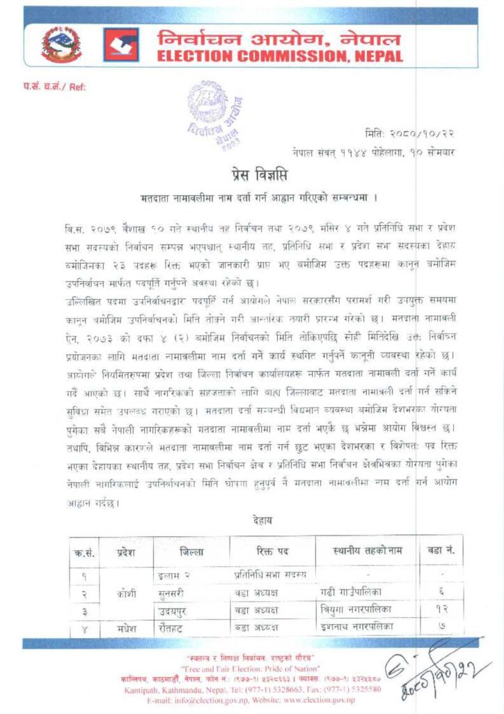 आयोगले आज विज्ञप्ति निकालेर उपचुनावको मिति घोषणा हुनुअघि नै नाम दर्ता गर्न आह्वान गरेको हो । २०७९ सालको वैशाख १० गते पालिका चुनाव र मङ्सिर ४ गते प्रतिनिधि सभा र प्रदेश सभा सदस्यको चुनाव भएपछि रिक्त पदहरूमा उपचुनाव गर्ने तयारी आयोगले गरेको छ ।