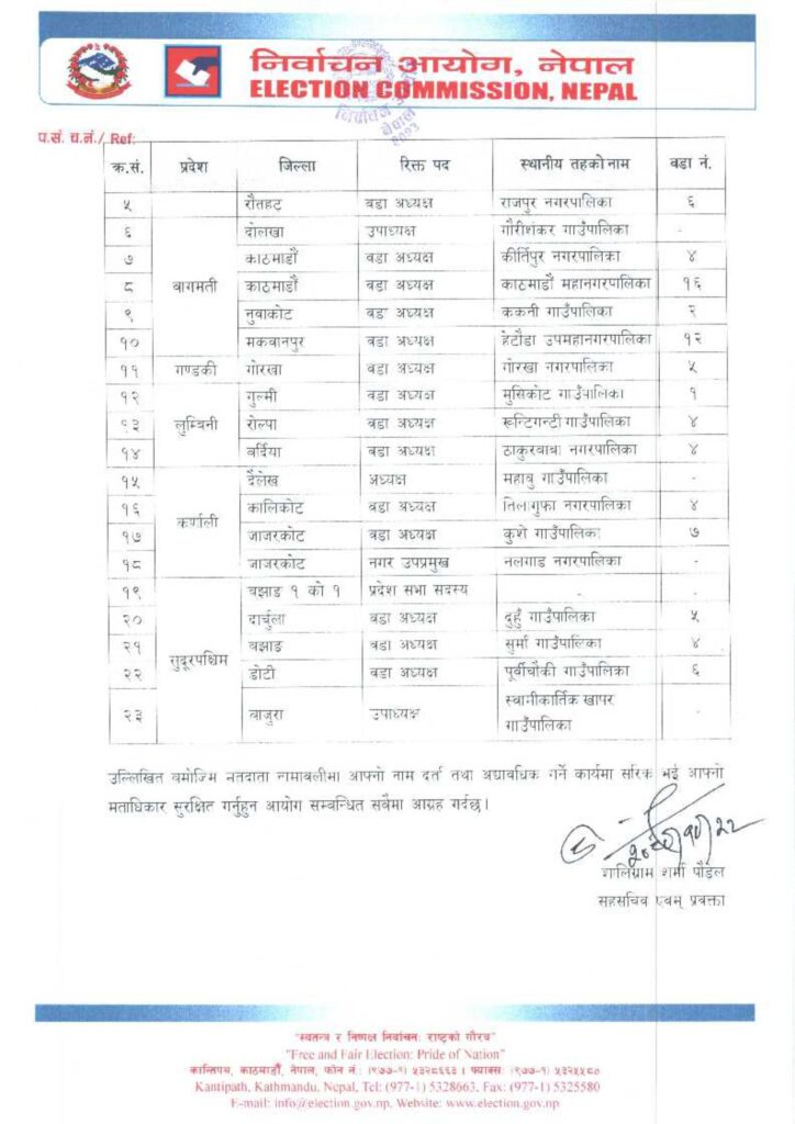 पालिका, प्रदेश सभा र प्रतिनिधि सभा सदस्यका २३ वटा पद रिक्त रहेकाले उपचुनाव गर्नुपर्ने आयोगले जनाएको छ । पद रिक्त रहेका क्षेत्रहरूको विवरणसहित आयोगले मतदाता नामावली दर्ता गर्न अनुरोध गरेको हो ।